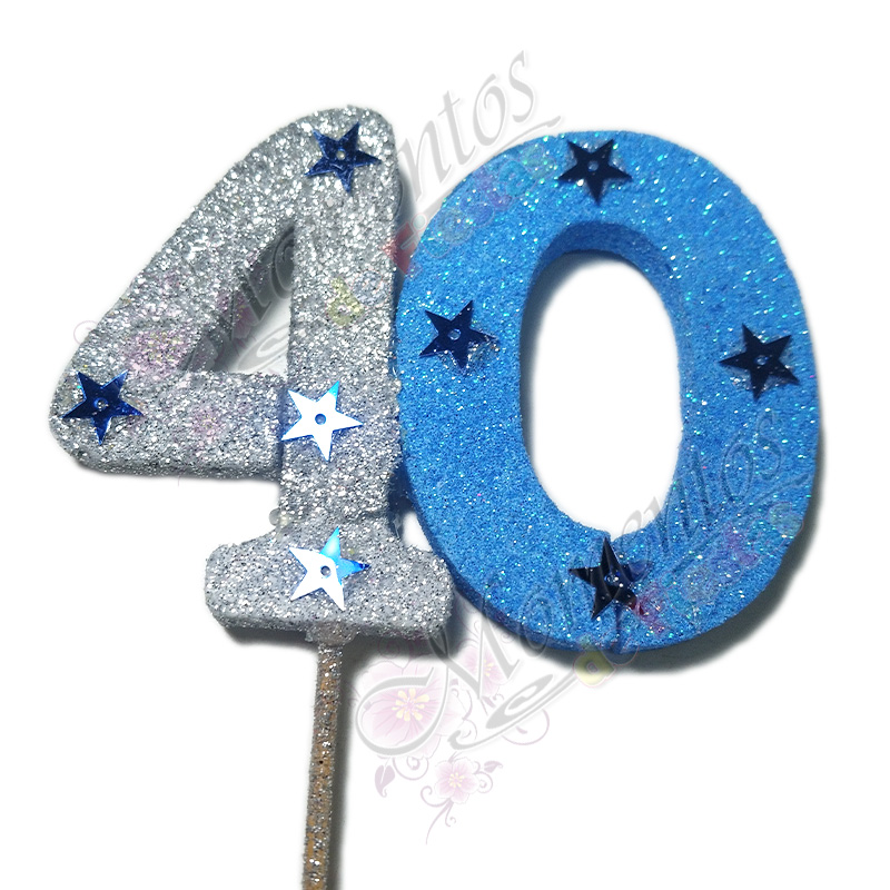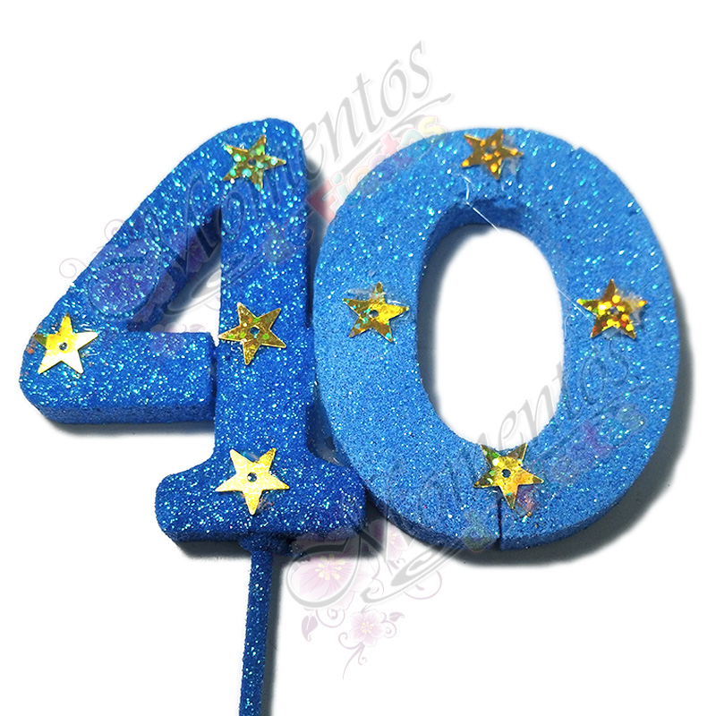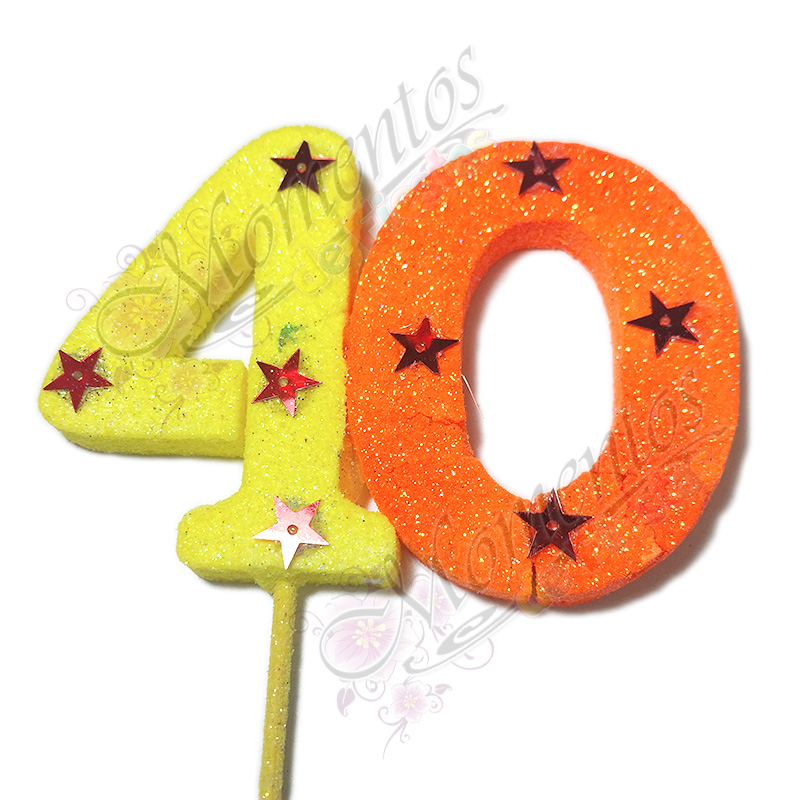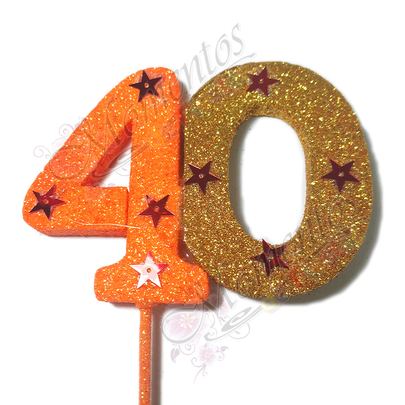 • Adorno de torta Número 40 pintado y glitterizado, montado sobre palito de brochet. Disponible en varios colores y presentado en bolsitas de 5 unidades. Ideal para celebrar cumpleaños, aniversarios y eventos especiales con un toque brillante y festivo.