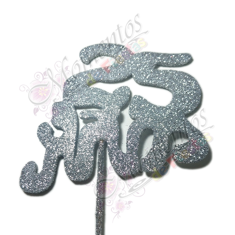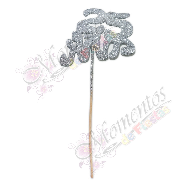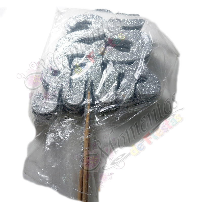 - Adorno de torta Frase 25 años pintado y glitterizado, montado sobre palito de brochet. Disponible en color plateado y presentado en bolsitas de 5 unidades. Ideal para celebrar cumpleaños, aniversarios y eventos especiales con un toque brillante y festivo.