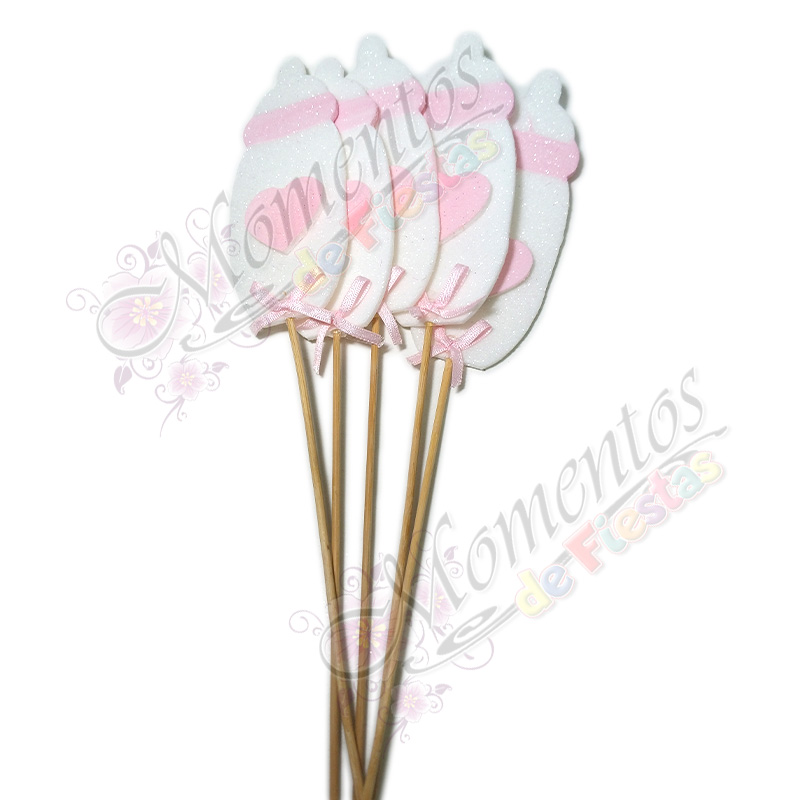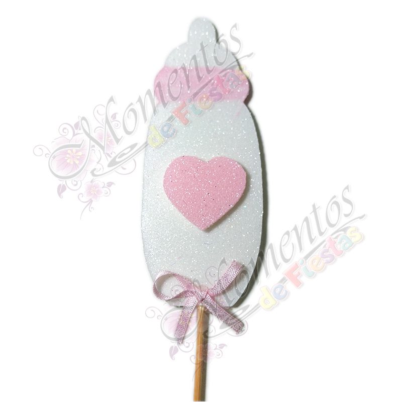 - Adorno de torta hecho a mano con mamaderita con glitter, montado en palito de brochet y presentado en bolsitas de 5 unidades.