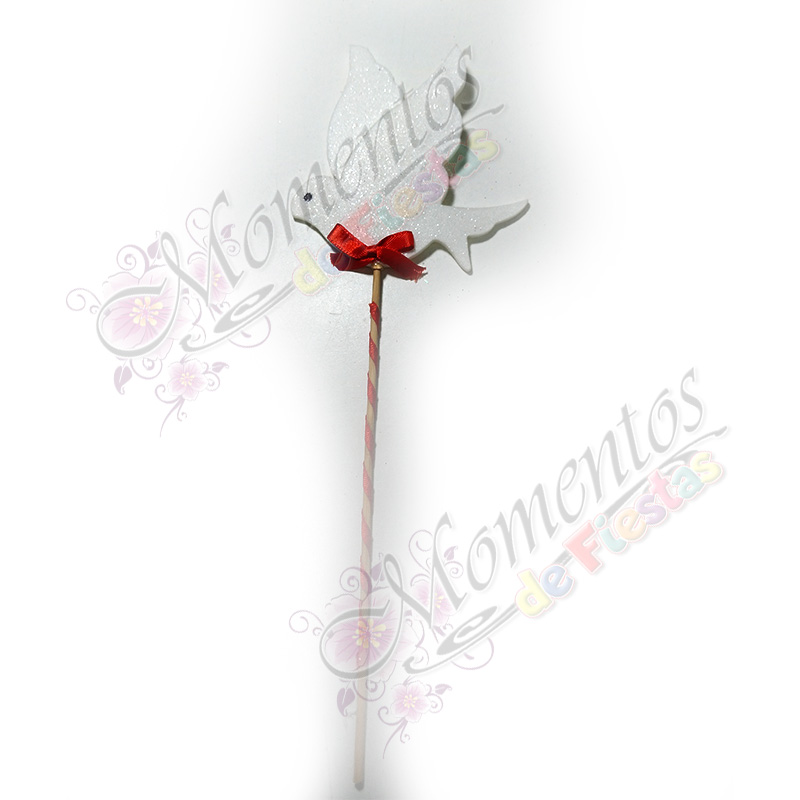 Adorno de torta en forma de paloma doble, hecho a mano y decorado con delicados detalles en brillo glitter, montado sobre palito de brochet para una colocación práctica y segura.