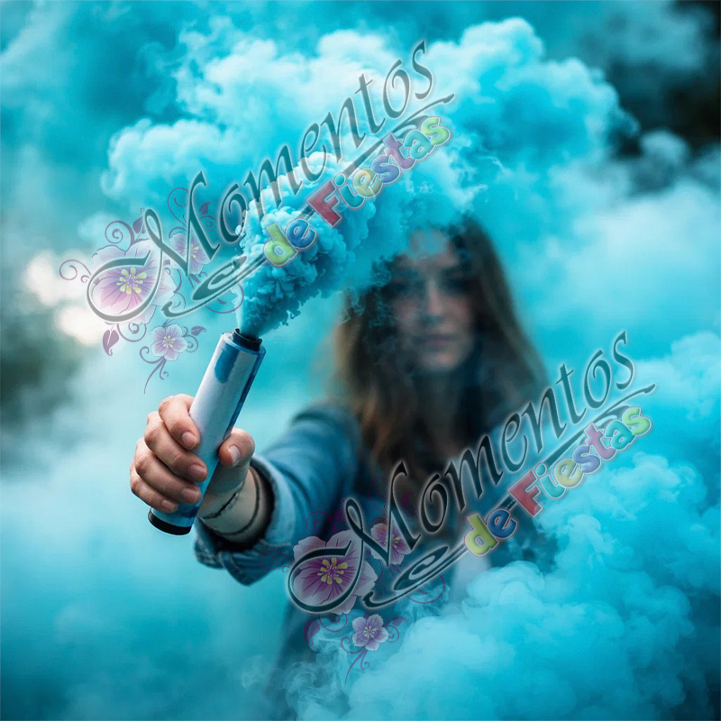 Al encender la mecha, libera una intensa nube de humo del color CELESTE, logrando un efecto llamativo, continuo y muy fotogénico.