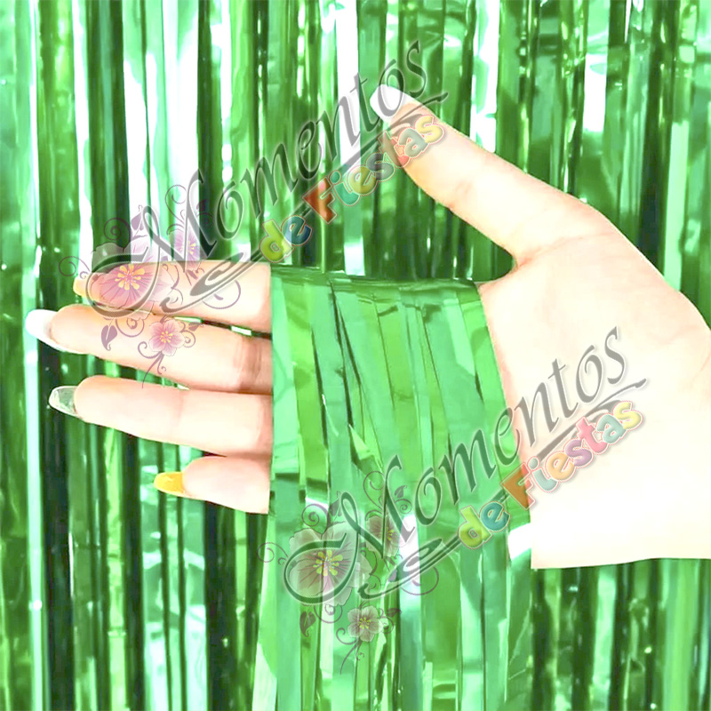 - Cortina metalizada decorativa Lisa en color VERDE CLARO, ideal para crear fondos llamativos y elegantes en todo tipo de celebraciones.