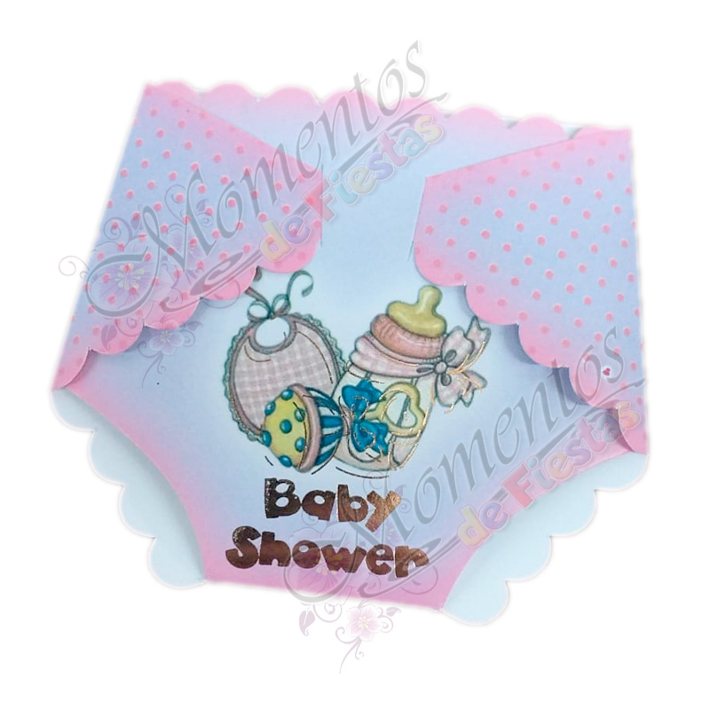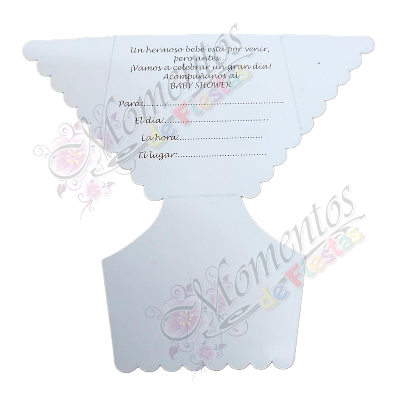 Su diseño troquelado permite presentar la tarjeta en distintas siluetas, como vestiditos, baberos, mamaderas, chupetes o pañales, aportando un detalle original y decorativo.
